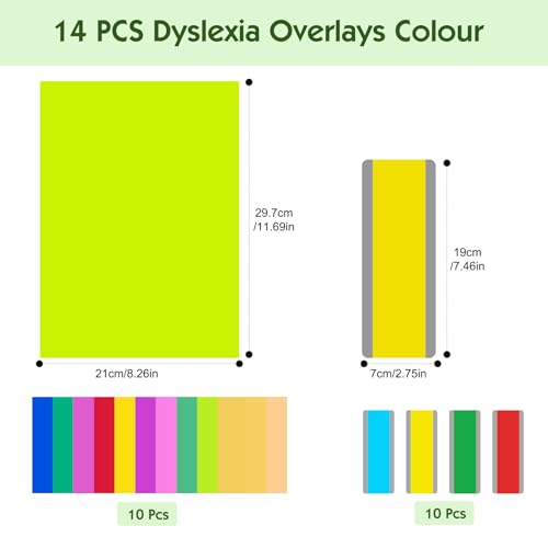 A4 Coloured dyslexia aids & Reading ruler – You will get 14 pieces dyslexia overlays, 10x A4 overlays for reading dyslexia, 4x reading ruler for dyslexia to help focus reading for all ages, for school, office, home